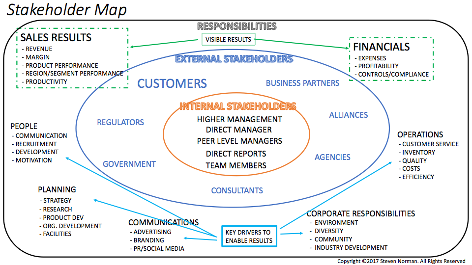 The graphic above is an example of a stakeholder map for a senior executive and the wide range of responsibilities they typically have to manage. We all know there is huge visibility and focus on the Sales and Financial results and, as I mentioned above, this is, and should be, front and centre. But we won’t be able to deliver these results sustainably unless we invest time and effort in the key drivers of our results. In the above example, those drivers include activities around People, Planning, Communications, Operations and Corporate Responsibility.